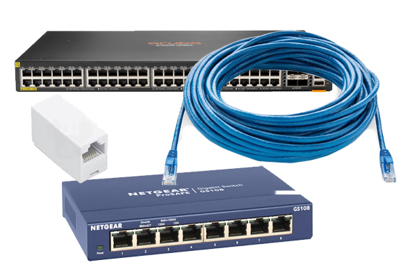 Netwerkkabels in meerdere kleuren en lengtes. Switches en routers voor thuisgebruik en bedrijven.
